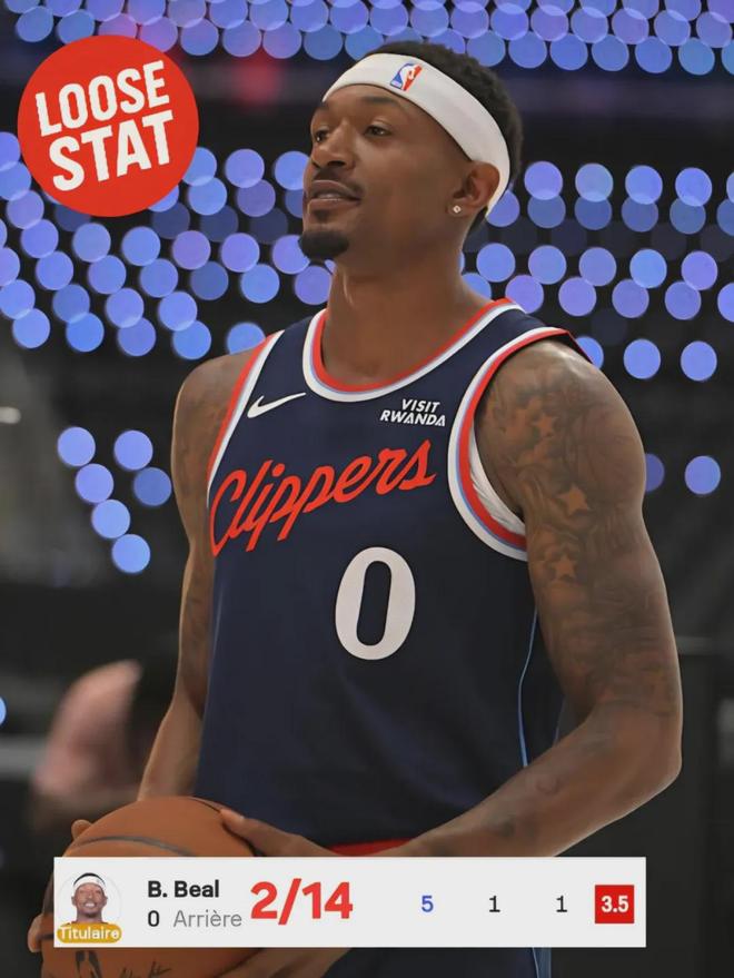 比尔本赛季在快船首发出战5场比赛,场均出战20.2分钟,仅得到7.4分1篮板1.4助攻0.4抢断0盖帽,投篮命中率35.9%,罚球命中率66.7%,这7项数据均是生涯最低。三分命中率33.3%,生涯第二低,仅高于2021-22赛季的30%。