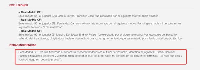本场比赛当值主裁亚历杭德罗-金特罗递交的官方比赛报告上,写道:“皇家马德里俱乐部:比赛结束后,在更衣室通道内,我认出球员卡瓦哈尔先生,他未穿运动服,而是身着便装,并对我说道:‘你们就这点水平,然后还在新闻发布会上哭。’”