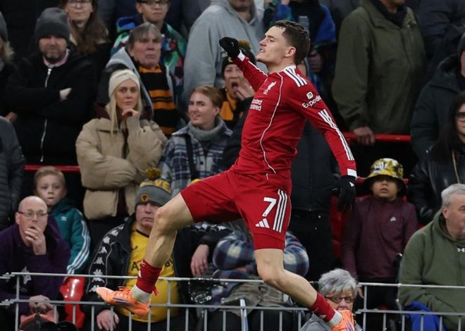 第38分钟,凯尔凯兹在禁区左侧起脚劲射,踢飞了。3分钟后,利物浦进球了!弗林蓬强行突破,下底送出倒三角回传球,赫拉芬贝赫直接推射近角,球进了!只过了1分钟,利物浦再次进球。维尔茨单刀推射破门,终于收获利物浦生涯首粒进球。半场结束,利物浦2-0领先狼队。